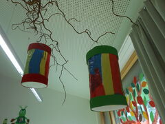 Der Laternenumzug der Krippenkinder fand im großen Speiseraum statt. Nach einer kurzen Begrüßung zogen die Krippenkinder zu dem Lied: „Laterne, Laterne“ mit ihren Eltern, Geschwistern und Großeltern durch den Raum. Danach fanden sich alle im Stuhlkreis ein. Ein Kind schlüpfte in die Rolle des St. Martins. Im darstellenden Spiel wurde in einem Lied veranschaulicht, was ein Soldat alles braucht. Als Symbol des Teilens wurde jedes Kind mit einer Martinsgans beschenkt, welche von Krippeneltern gebacken wurden. Anschließend zogen wir gemeinsam mit den Laternen ein paar Runden im Verkehrsgarten. Abschließend zogen wir auf den Parkplatz, wo sich auch schon die Kindergartenkinder wieder einfanden. Mit dem Abschlusslied der Georgsbläser klang das Laternenfest langsam aus.